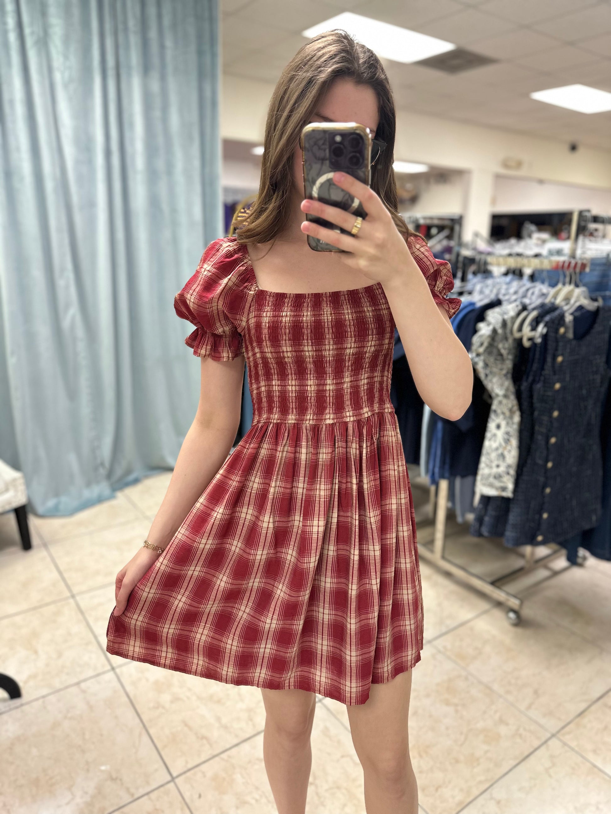 Sweet, classic, and oh-so-feminine — the Autumn Charm Plaid Dress is perfect for the season. Featuring a flattering square neckline, puff sleeves, and a smocked bodice for a comfortable, flexible fit, this dress brings timeless charm with its soft red and cream plaid pattern. The flowy skirt adds a playful touch, making it ideal for fall festivals, brunch dates, or casual days out.