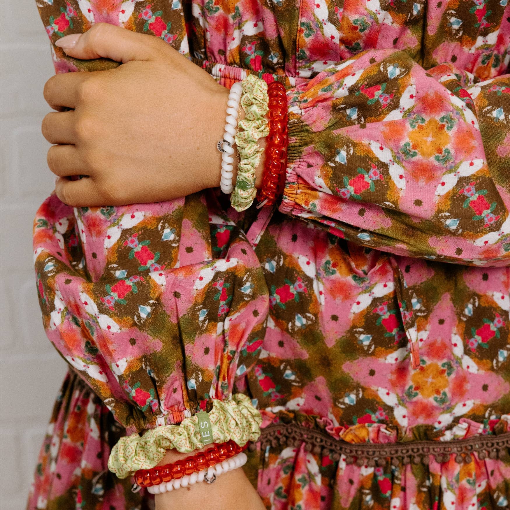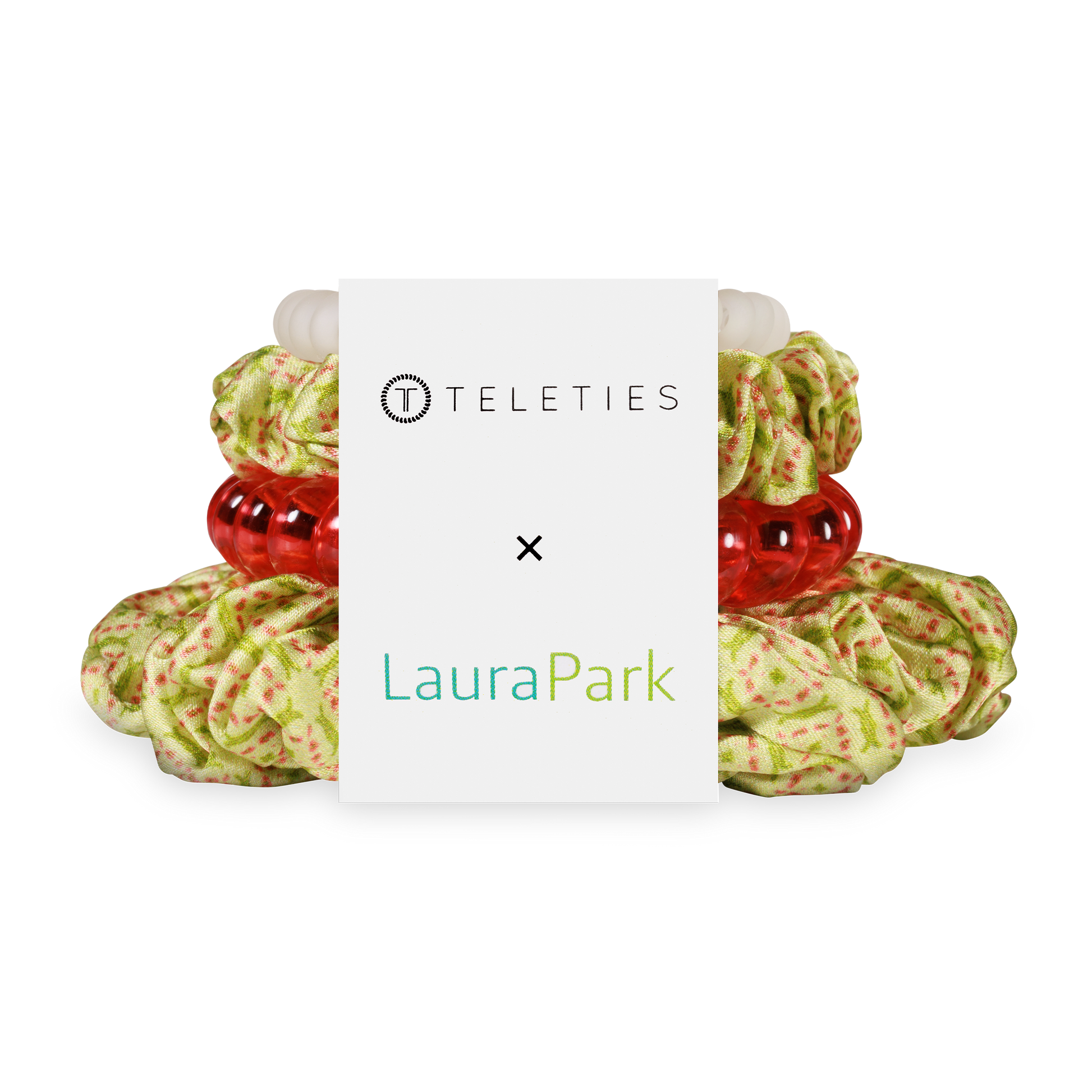 Berry Cozy Mix Pack Hair Ties in Green, Red, and White offer a strong grip without damage, doubling as a stylish bracelet when not in use. The TELETIES x Laura Park Holiday Collaboration features bold, playful designs that combine Laura’s vibrant art with TELETIES signature function.