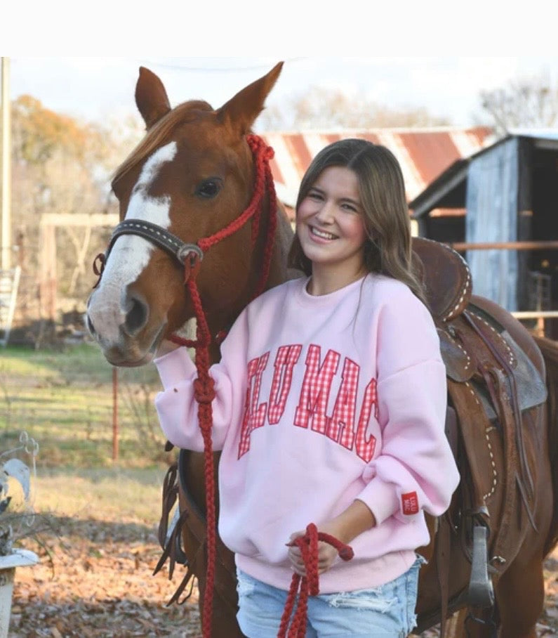Celebrate love in style with the Pink Lulu Mac Crewneck from the Valentine's Day Collection. This charming crewneck sweater features eye-catching red gingham letters, adding a delightful pop of color that's perfect for the season. Made from soft, cozy fabric, it provides both warmth and comfort, making it an ideal choice for Valentine's Day festivities or casual outings. Pair it effortlessly with jeans, skirts, or leggings to create a sweet and stylish look that expresses your love and affection on any day.