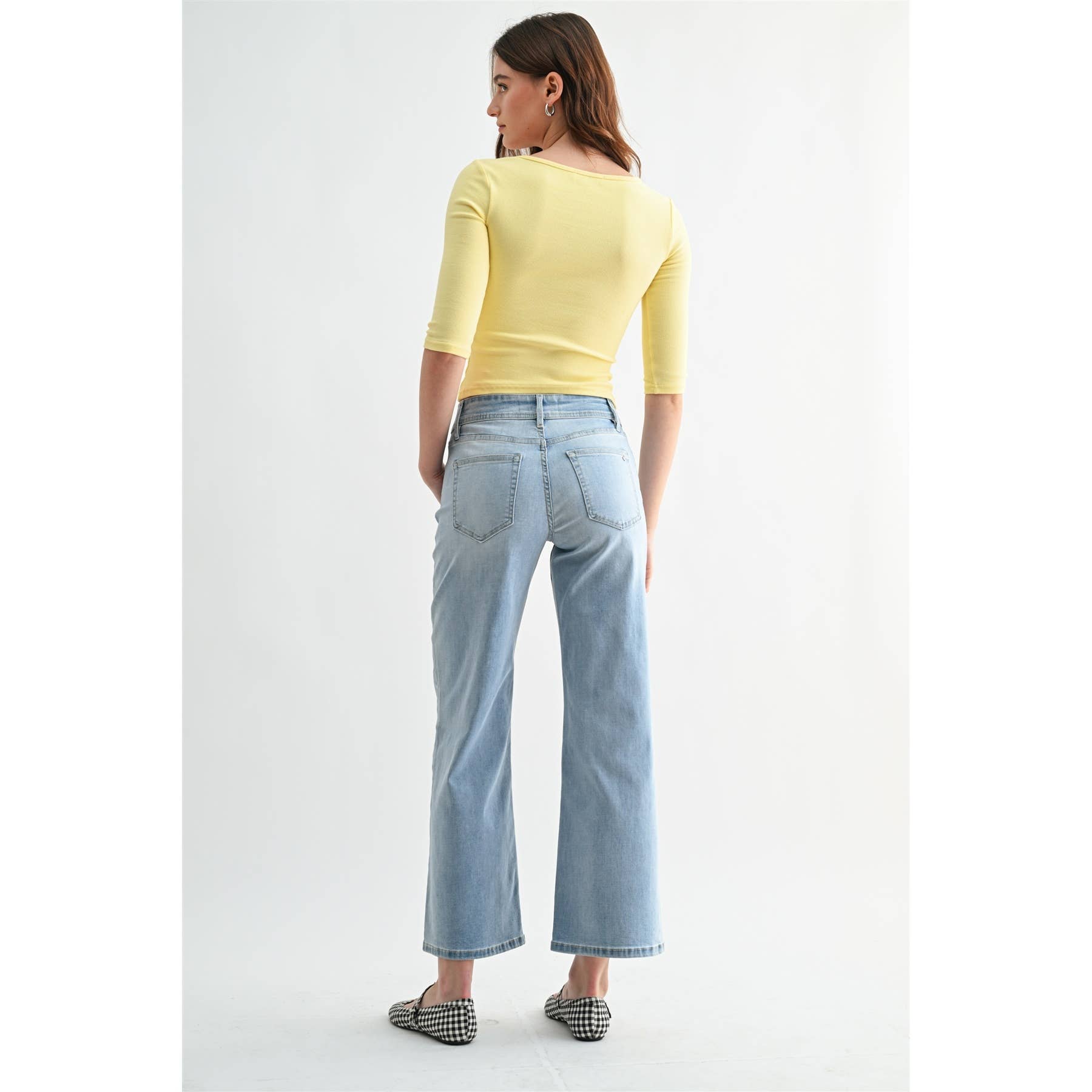 The Mica Mid-Rise Wide Leg Ankle Jeans in a light wash offer a relaxed yet polished take on everyday denim. Designed with a comfortable mid-rise fit and a flattering wide-leg silhouette, these jeans hit at the ankle for an easy, modern look. The light wash adds versatility, making them perfect to pair with everything from casual tees to elevated blouses.