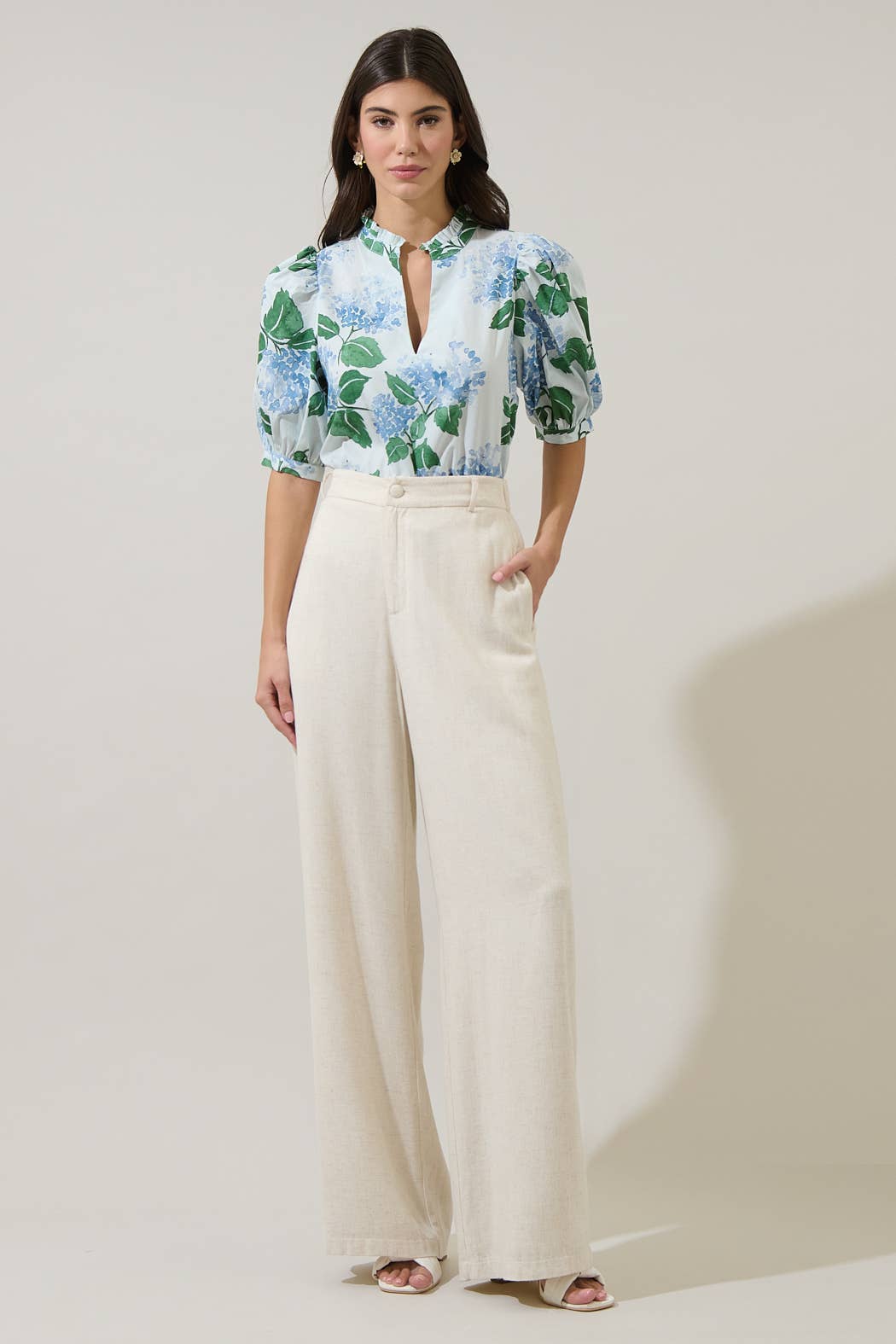 Start your day off stylishly with the Mirla Floral Terri Puff Sleeve Top. This delightful top features a split front neckline beautifully adorned with ruffles, adding a touch of charm. The short puff sleeves enhance its cute appeal, making it perfect for warm days. Made in a lovely blue-green mul color, this top pairs effortlessly with shorts or high-waisted pants for a chic and casual look. Embrace comfort and style with this versatile addition to your wardrobe that’s perfect for everyday wear.