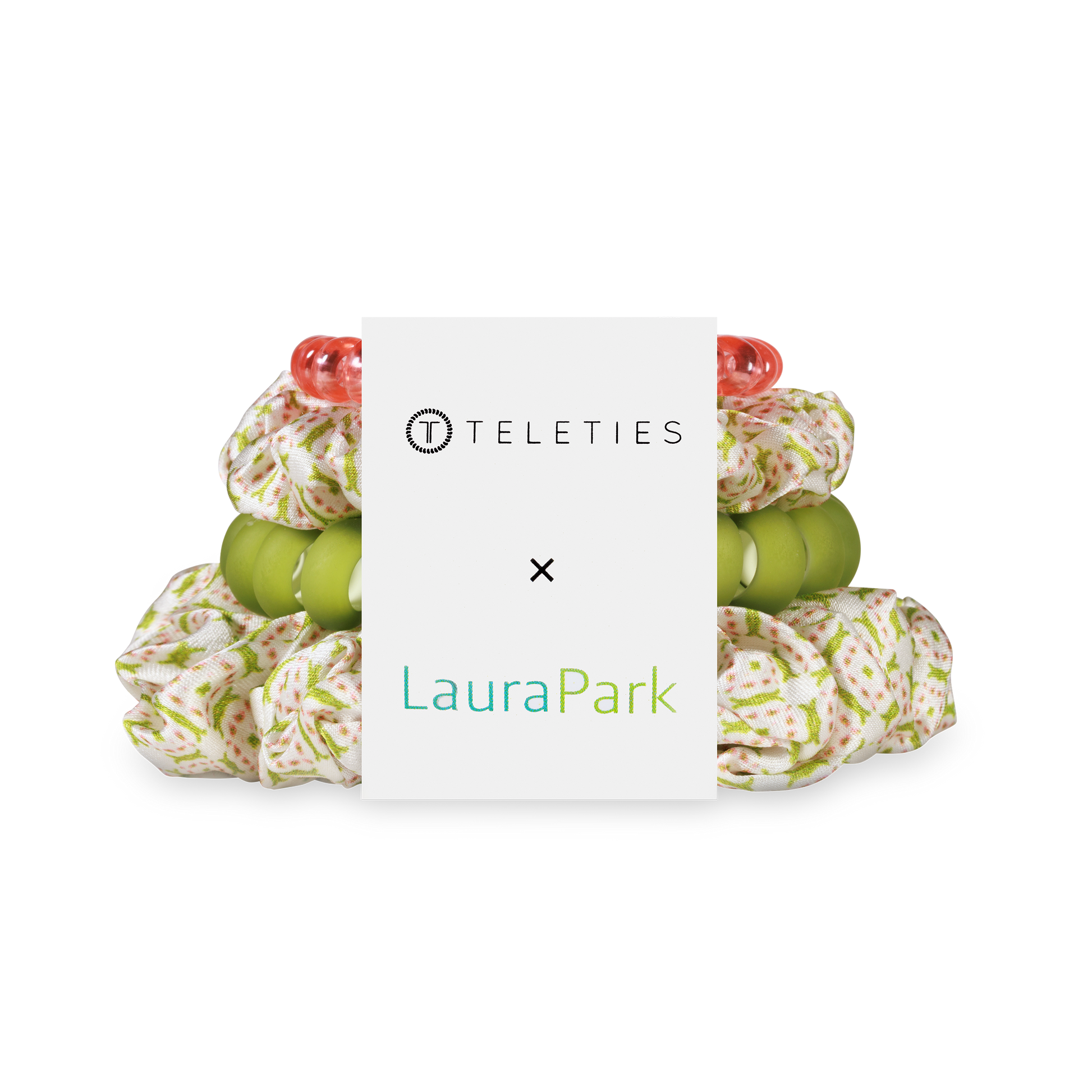 Pine & Pearl Mix Pack Hair Ties in Green, Red, and White offer a strong grip without damage, doubling as a stylish bracelet when not in use. The TELETIES x Laura Park Holiday Collaboration features bold, playful designs that combine Laura’s vibrant art with TELETIES signature function.