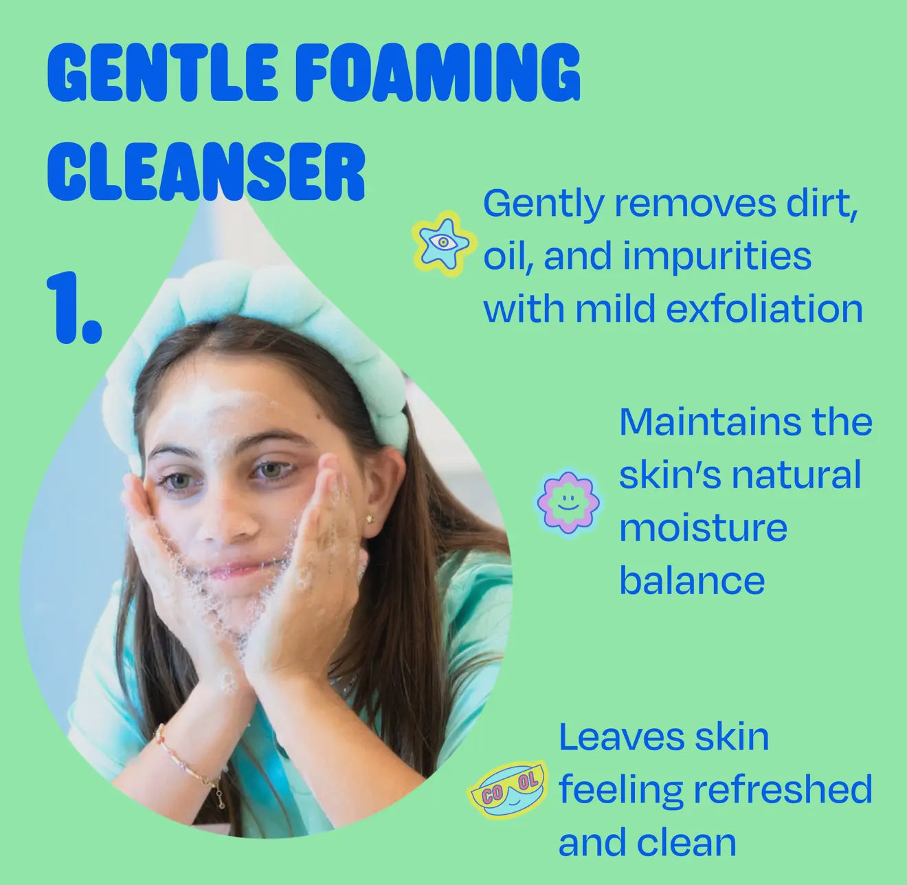 3-Step Skincare Routine for Tweens: Everything young skin needs to stay clean, hydrated, and glowing. This complete alcohol-free bundle includes a gentle foam cleanser, lightweight moisturizer, and refreshing facial mist-perfect for morning and nighttime routines.