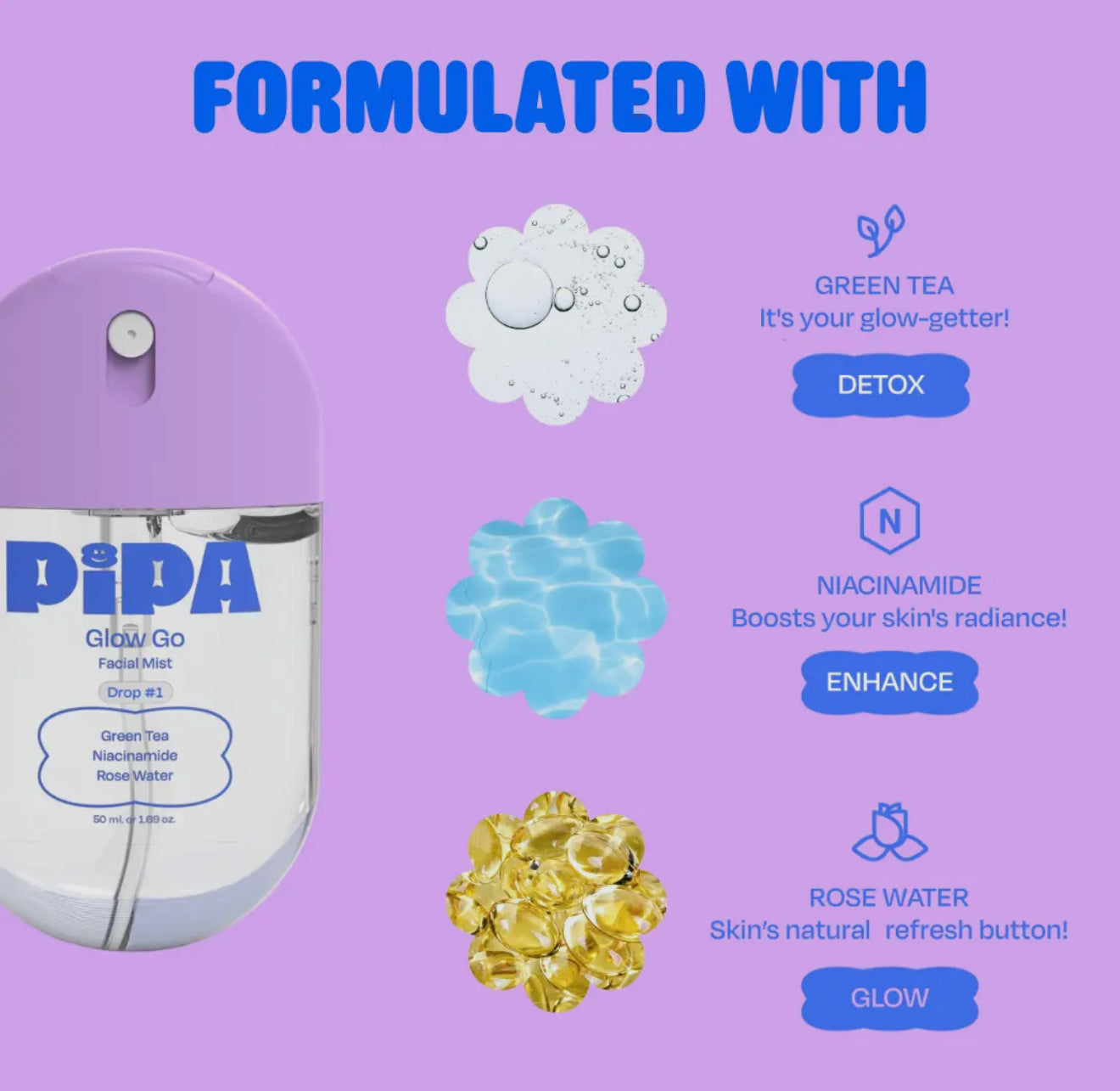 Refreshing Face Mist - Glow Go: Infused with rose water and niacinamide to soothe, hydrate, and add a dewy glow throughout the day. Perfect for a midday refresh or post-activity cool-down.