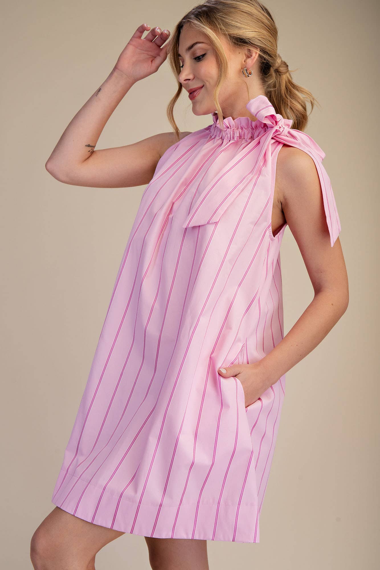 Elevate your style with this Round Neck Tie Sleeveless Mini Dress, featuring a charming bow tie on the collar and playful stripes. The round neckline adds a touch of sophistication, while the tie detail enhances the feminine appeal of the dress. The sleeveless design makes it perfect for warm weather or layering with a light jacket. With its flattering mini length and vibrant stripes, this dress is ideal for casual outings, summer parties, or brunch with friends. Embrace a chic yet playful look with this delightful addition to your wardrobe!