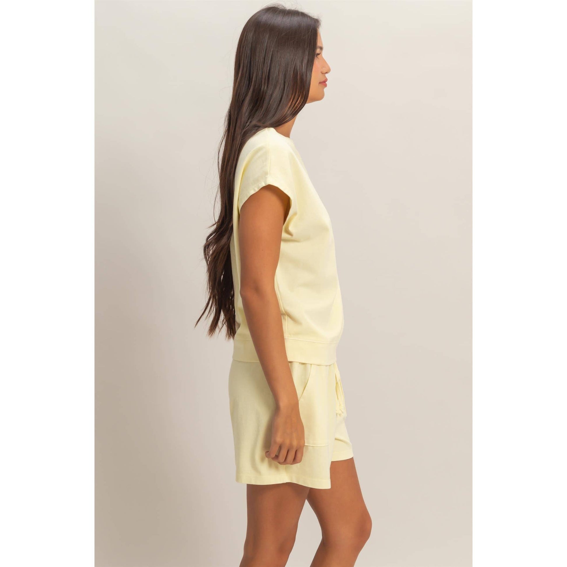 This cozy two-piece set features a sleeveless crew neck top with a distinct ribbed knit trim at the hem along with mid-rise shorts that feature an elastic waistband with front patch pockets. Ideal for lounging at home or a relaxed outing, style with sneakers and a jean jacket for a casual look.