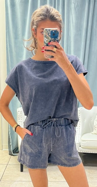 Effortless comfort meets laid-back style in the Cali Mineral Wash Lounge Set. This two-piece ensemble features a relaxed-fit top with cuffed sleeves and matching drawstring shorts designed for all-day ease. The soft, washed fabric gives it a lived-in, vintage-inspired finish, while functional front pockets add a practical touch. Perfect for casual days, weekend errands, or cozy nights in, this set delivers an effortlessly cool, relaxed vibe without sacrificing style.