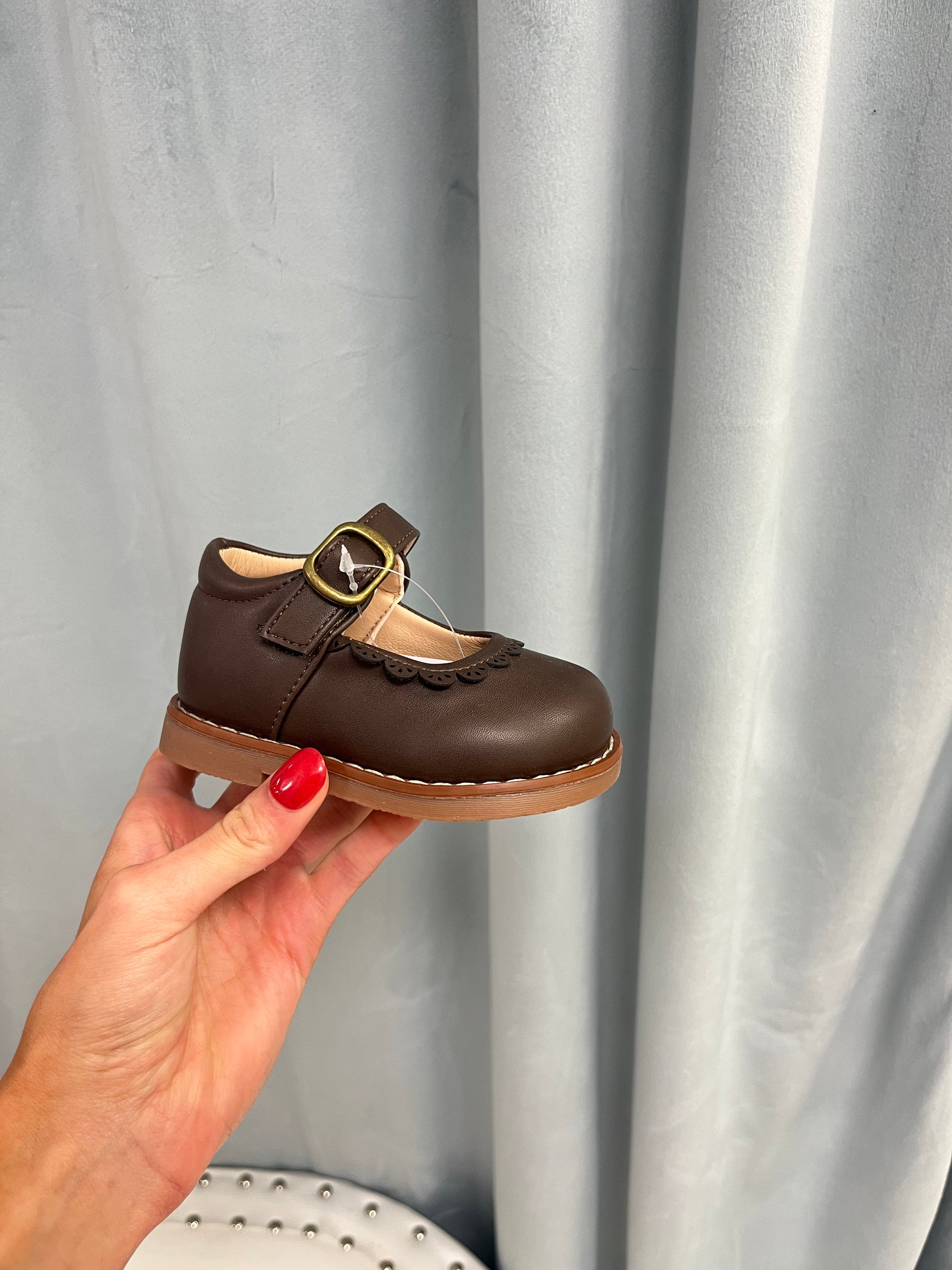 Sweet and timeless, The Charlotte Mary Jane brings classic charm to any little one’s outfit. Featuring a rich chocolate-brown finish, scalloped detailing, and a gold buckle strap, these darling shoes are perfect for both special occasions and everyday adventures. With a soft inner lining and sturdy sole, they combine comfort and cuteness in one adorable package.