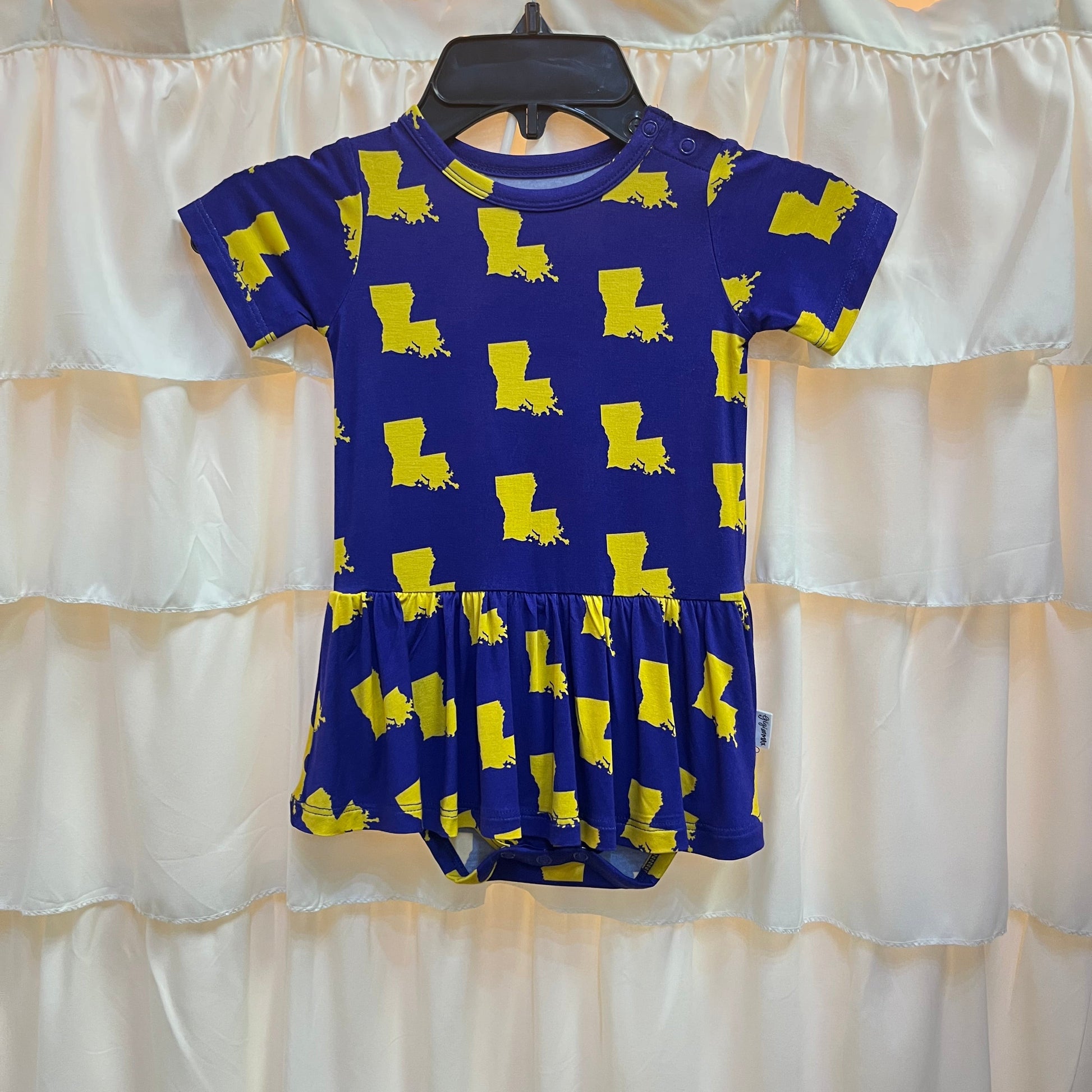 The Louisiana Love Bubble is a spirited essential for your little fan! This playful bubble features an allover state print with a ruffled skirted bottom for a dressy touch. Soft, stretchy, and easy to move in — it’s perfect for game days, parades, or everyday Southern pride.