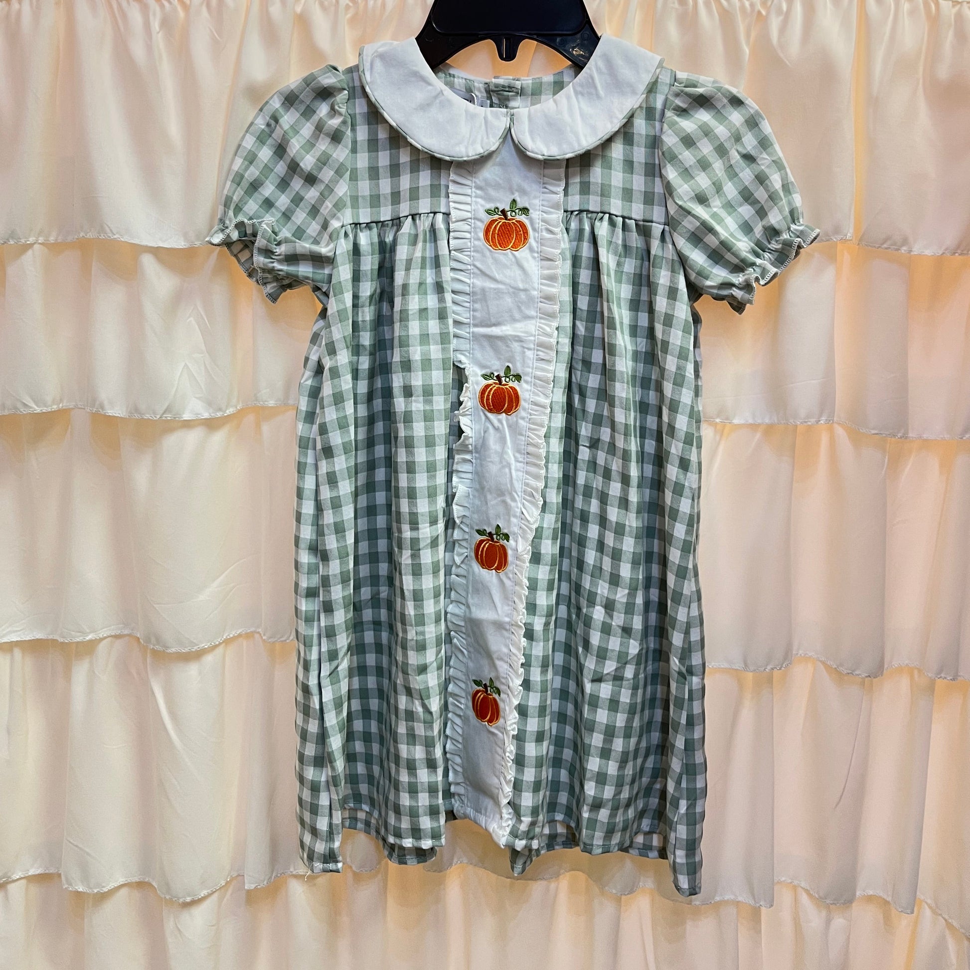 The Pumpkin Patch Gingham Dress is the perfect fall favorite for your little girl! This sage green and white gingham dress features embroidered pumpkins down the front ruffle placket for a sweet seasonal touch. The classic Peter Pan collar and puff sleeves add vintage charm, while the soft cotton fabric ensures all-day comfort for pumpkin patch visits, Thanksgiving gatherings, or fall photos.