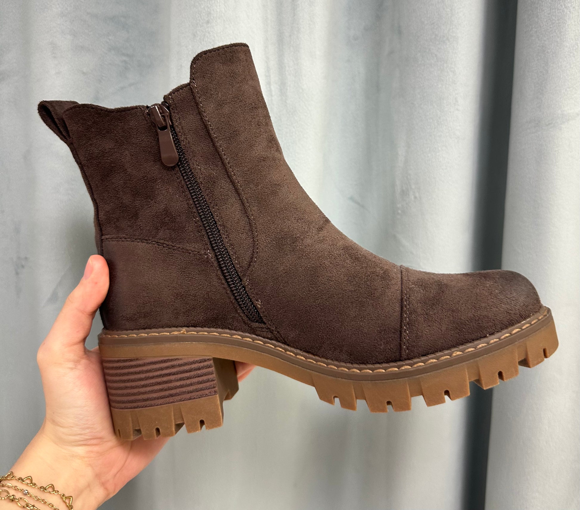 Rugged style meets everyday comfort with The Sierra Ridge Bootie. Crafted from soft suede-like material with a sturdy lug sole, these boots are made for cooler days and confident strides. The stacked block heel and side zipper make them easy to wear while giving you a subtle lift. Perfect for pairing with jeans, leggings, or flannel dresses — these booties bring cozy fall vibes with a touch of edge.