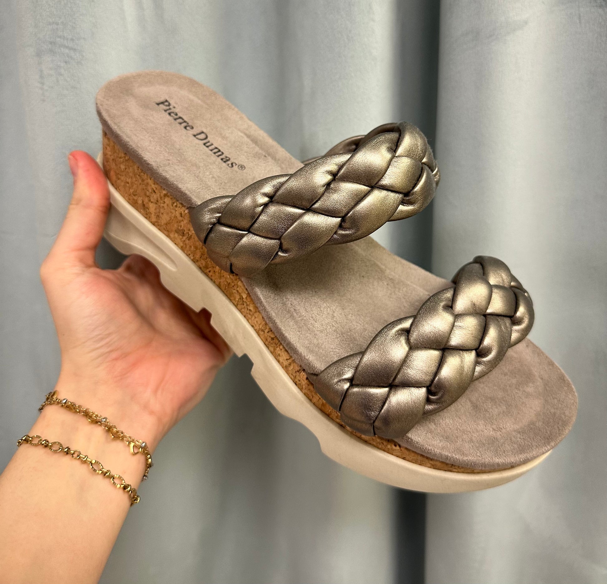 Add a little shine to your step with The Silver Sands Platform — a perfect blend of comfort and modern flair. Featuring soft metallic braided straps, a cork-style platform, and a cushioned suede footbed, these sandals deliver all-day wearability with a stylish lift. The neutral shimmer makes them easy to dress up or down — ideal for pairing with summer dresses, cropped jeans, or flowy skirts. Effortless, elevated, and oh-so chic!