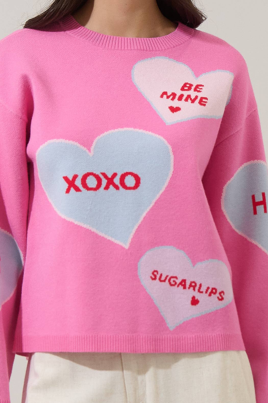 Spread the love and sweetness with this adorable sweater, perfect for adding warmth and charm to your wardrobe. Crafted from a super soft, cozy knit, this crewneck offers a relaxed fit and long sleeves, making it ideal for casual days or cozy nights. The ribbed design along the edges adds a touch of texture and detail. Pair this versatile sweater with denim jeans for a laid-back look or opt for white pants for a fresh, stylish ensemble. Embrace comfort and femininity with this must-have addition to your collection!
