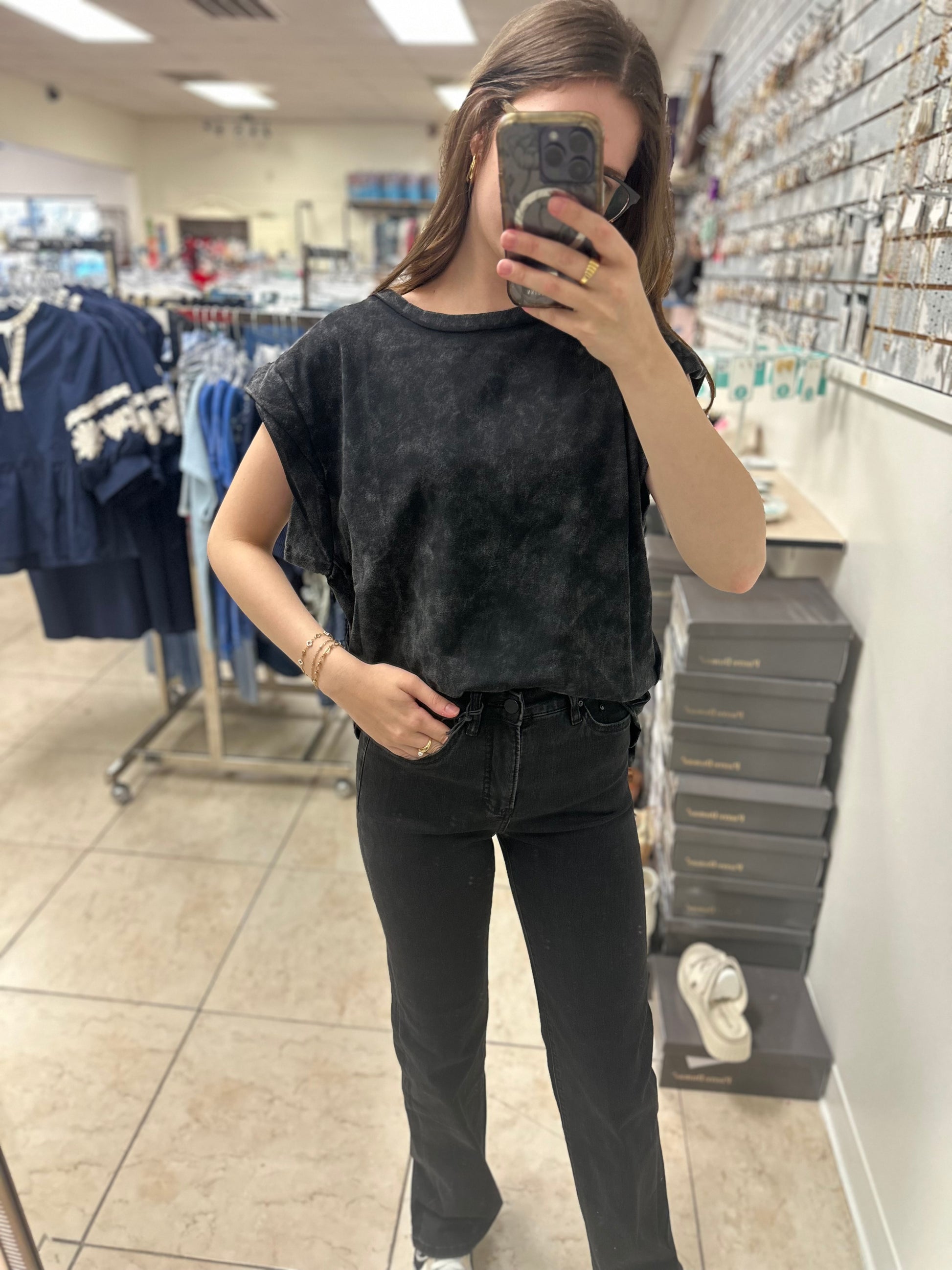 Effortlessly cool and perfectly relaxed — this washed black muscle tee is the ultimate casual essential. Designed with a slightly padded shoulder and soft mineral-washed finish, it adds just the right edge to your everyday look. Pair it with denim or leather for an easy, trend-forward vibe.